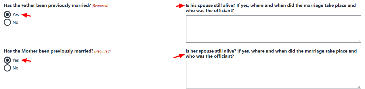 * Has the Father been previously married? (This was added) If yes, is his spouse still alive? If yes, where and when did the marriage take place and who was the Officiant? (These 2 questions were not)