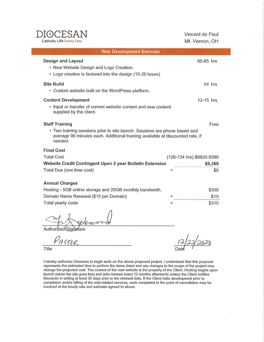 I think the best route to take is the hybrid style of our process we discussed. You and Father can review the sites and provide feedback. Also, you can let me know which option might be the best fit for your parish. Feel free to also include websites you liked along with what you like about that particular website. My team will then be able to review this information and we can schedule our Deep Dive conversation via Zoom to finalize the design idea.