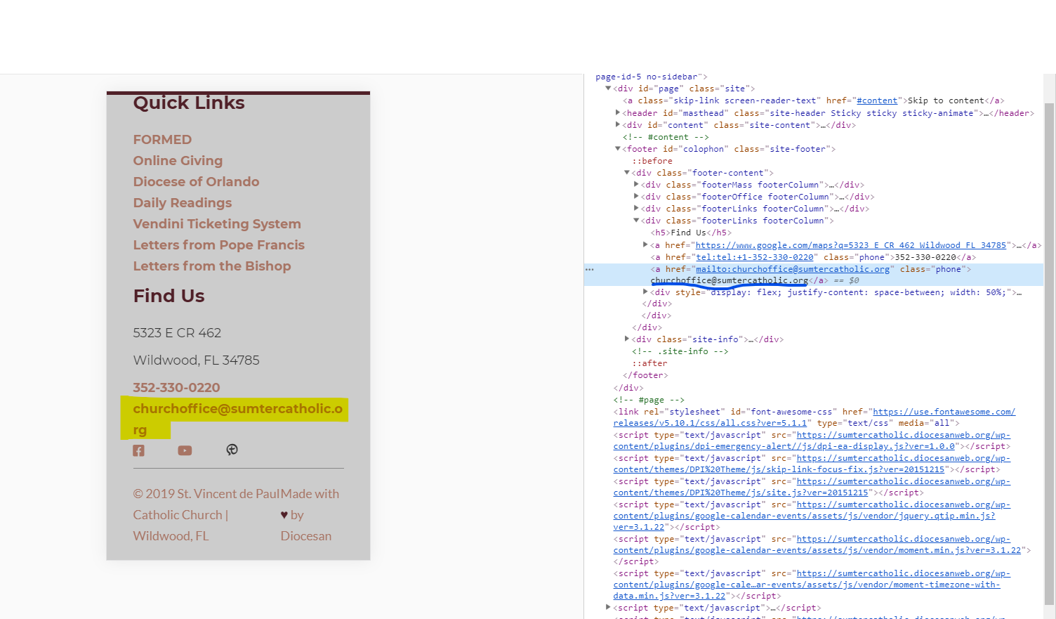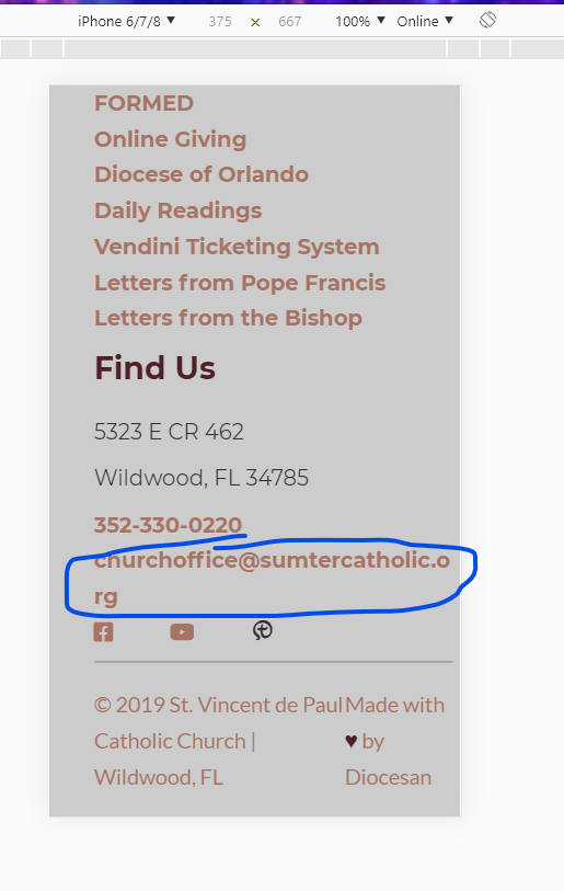 Can you replace the churchoffice@sumtercatholic.org text with Email the Office? Keep it a link and keep the href the same, just change the Text of it, so that it isn't as long. Thanks.