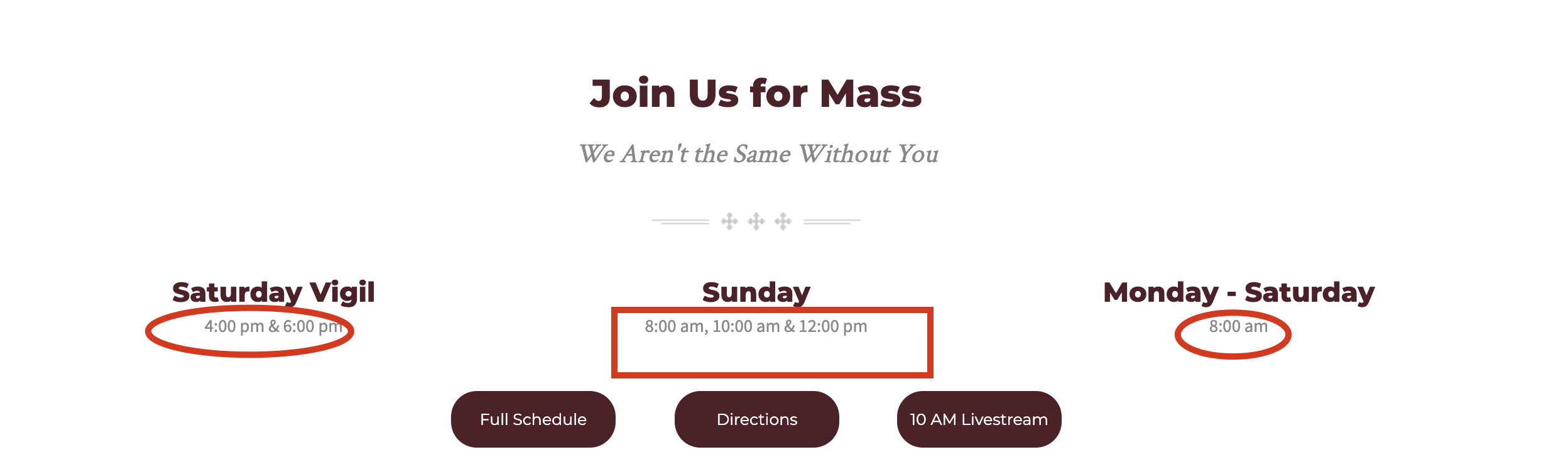 ✔ Homepage - Mass Section Mass Times e.g. 8:00 AM should be same size as the subtitle