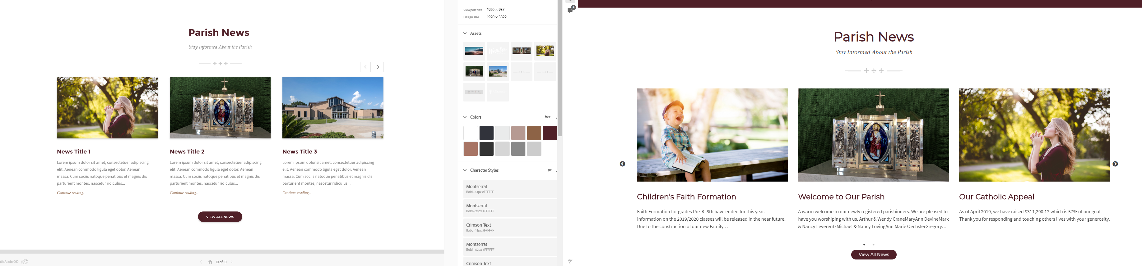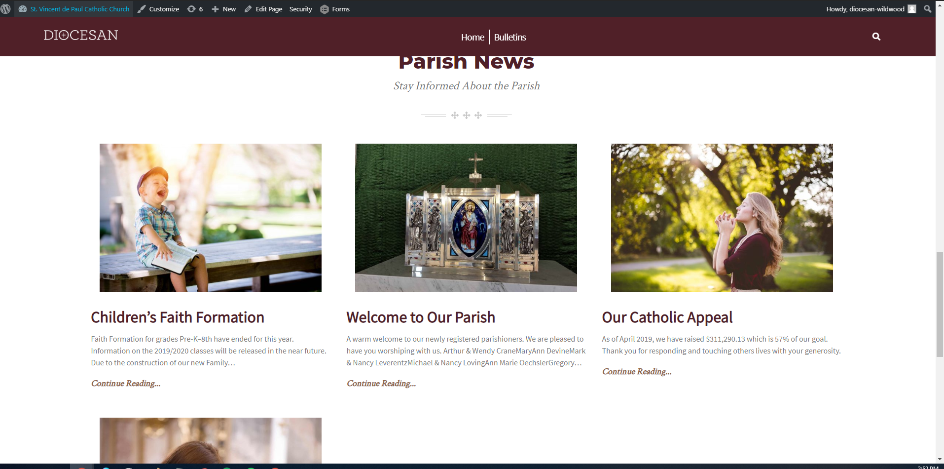 - Post titles ("Children's Faith Formation, "Welcome to Our Parish", "Our Catholic Appeal") needs to match mock-up