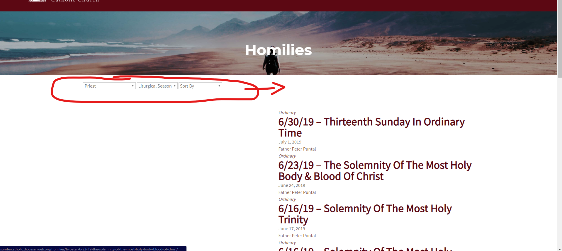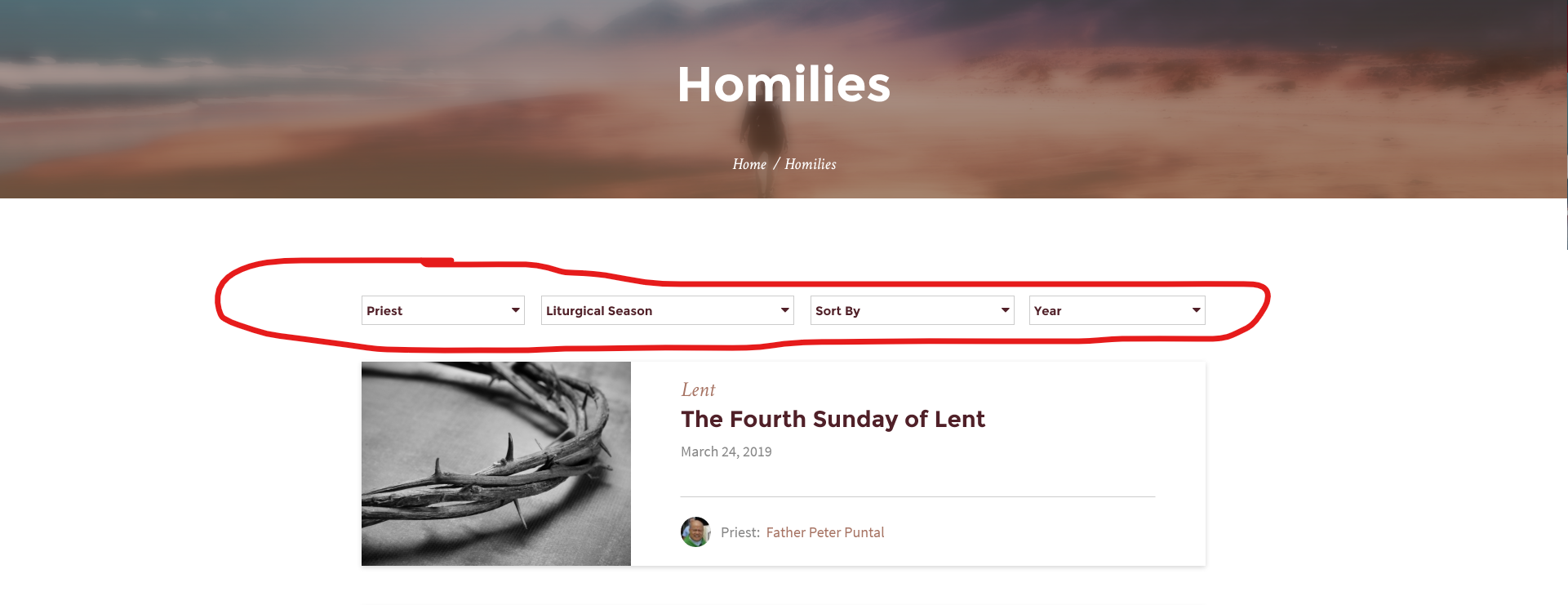 Alignment of the dropdowns should be more centered/ in the middle of the page. It should go the same width as the homily boxes. Starting and ending when the homily box starts and ends.