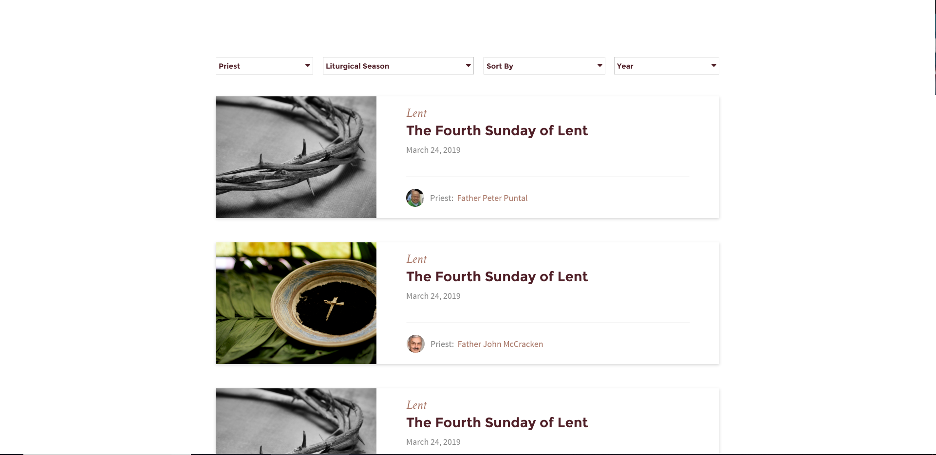 The featured image and the information for the homily should be in a container box that should line up with the dropdowns in the middle of the page.