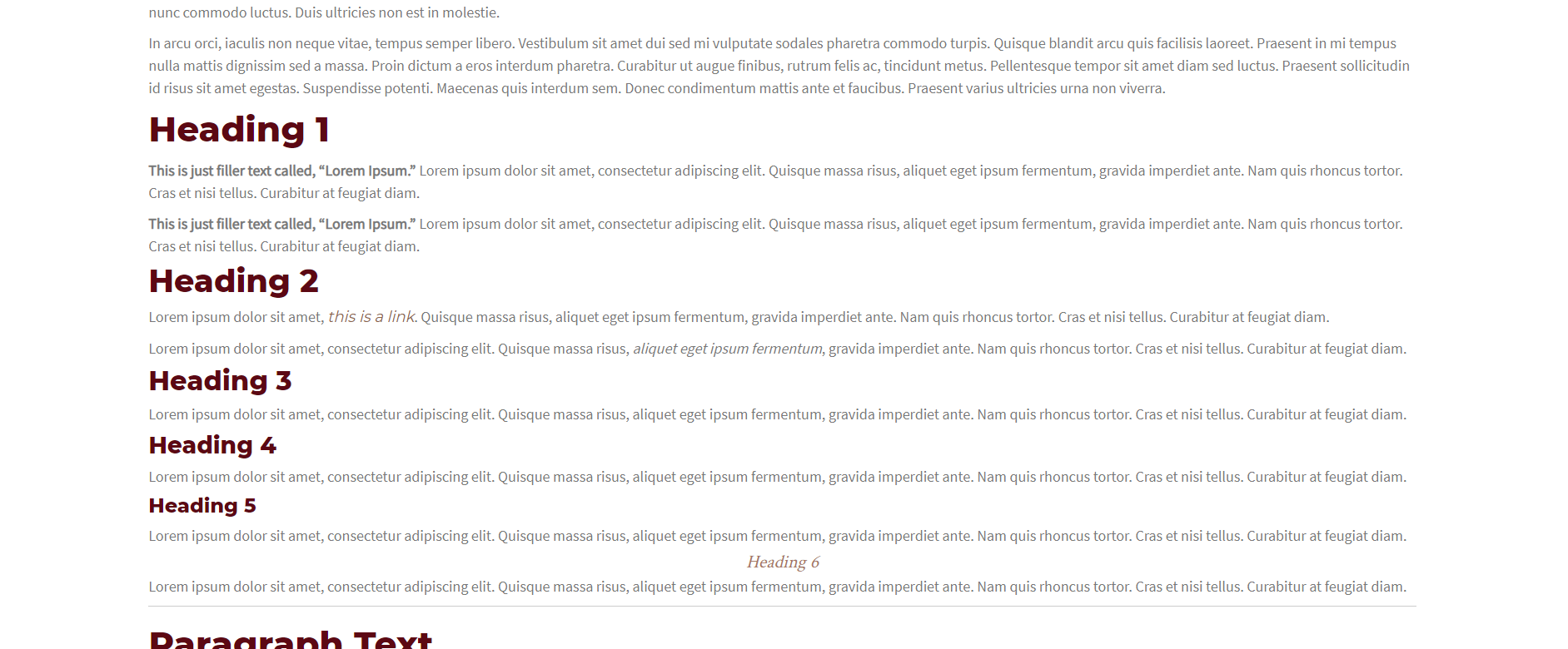 Inner Pages Heading list, what they should be- H1, 42px, Montserrat, Bold/800, 50px Line-height, #502028